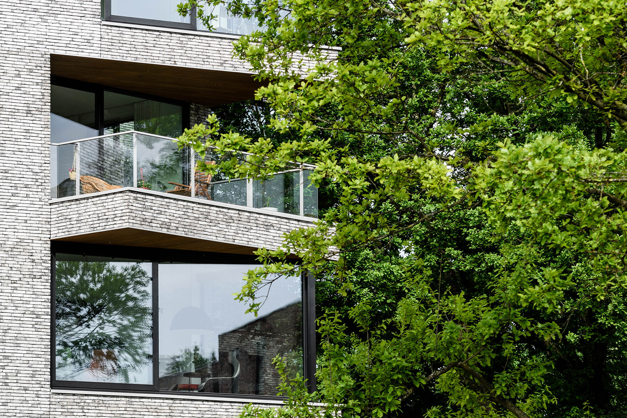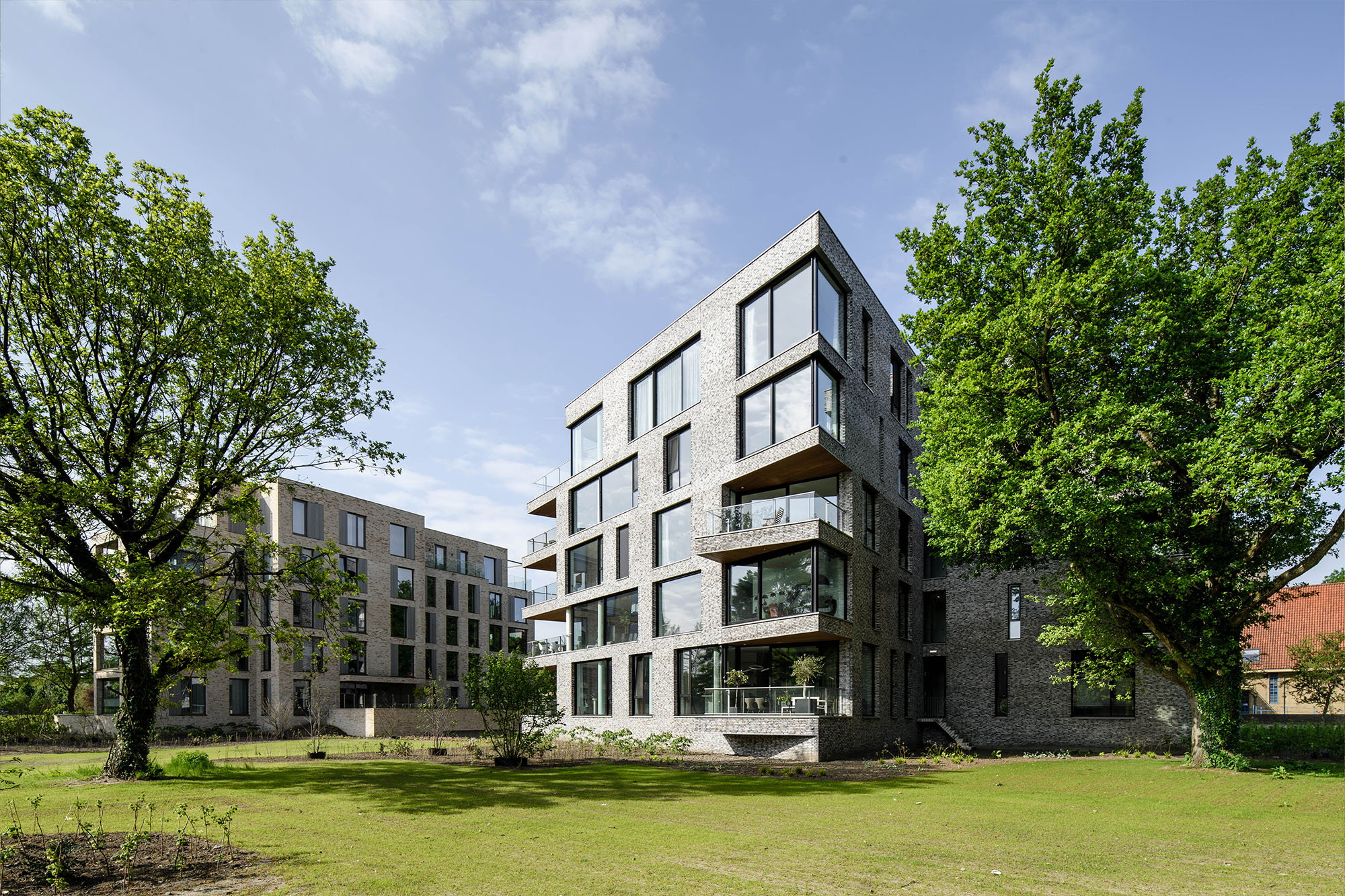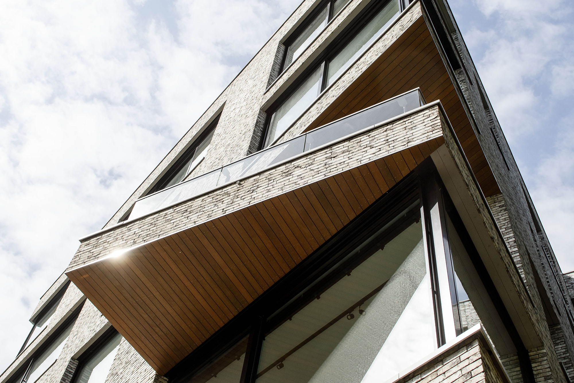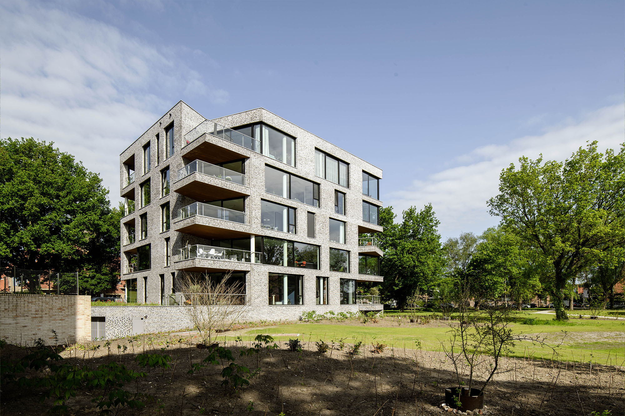 De gevel heeft in verhouding veel glas om de verbinding tussen binnen en buiten zo sterk mogelijk te maken. Door de verschillende woning plattegronden ontstaat er een compositie van herhalende raamopeningen en grote afwijkende vensters, waarbij het dichte gevelvlak rondom continueert en samenhang creëert. De privé buitenruimte zijn op de hoeken gepositioneerd en kragen soms iets uit voor een optimale bezonning en uitzicht.