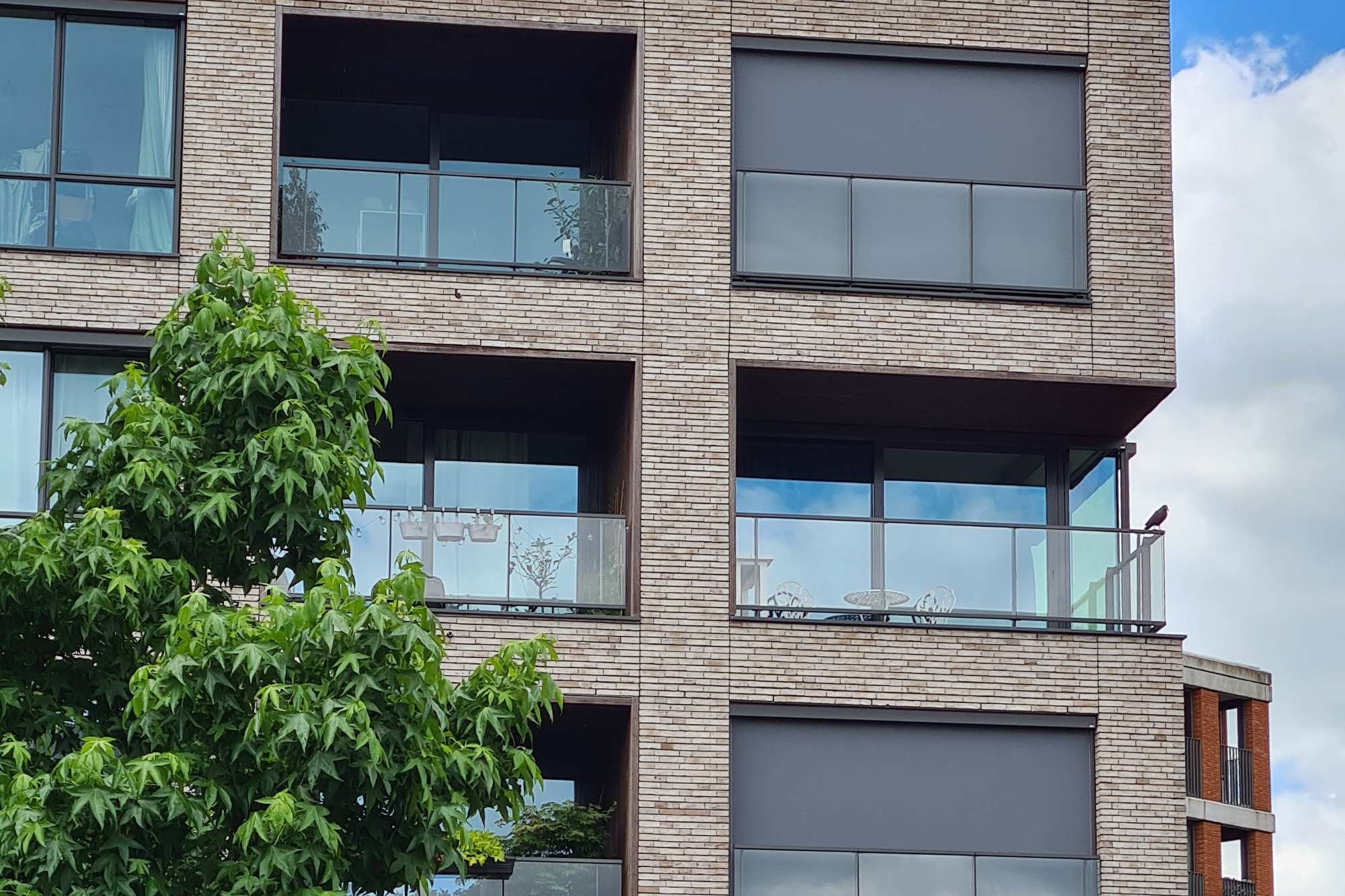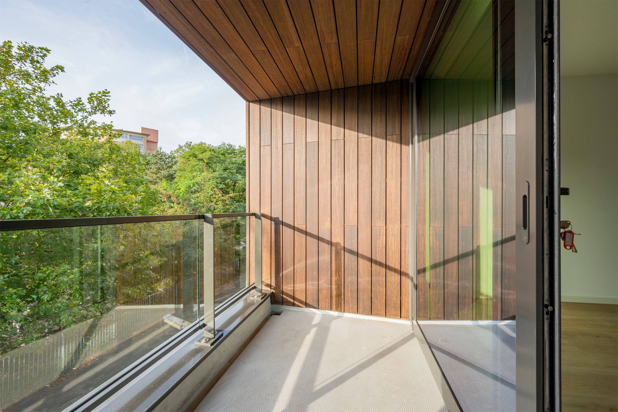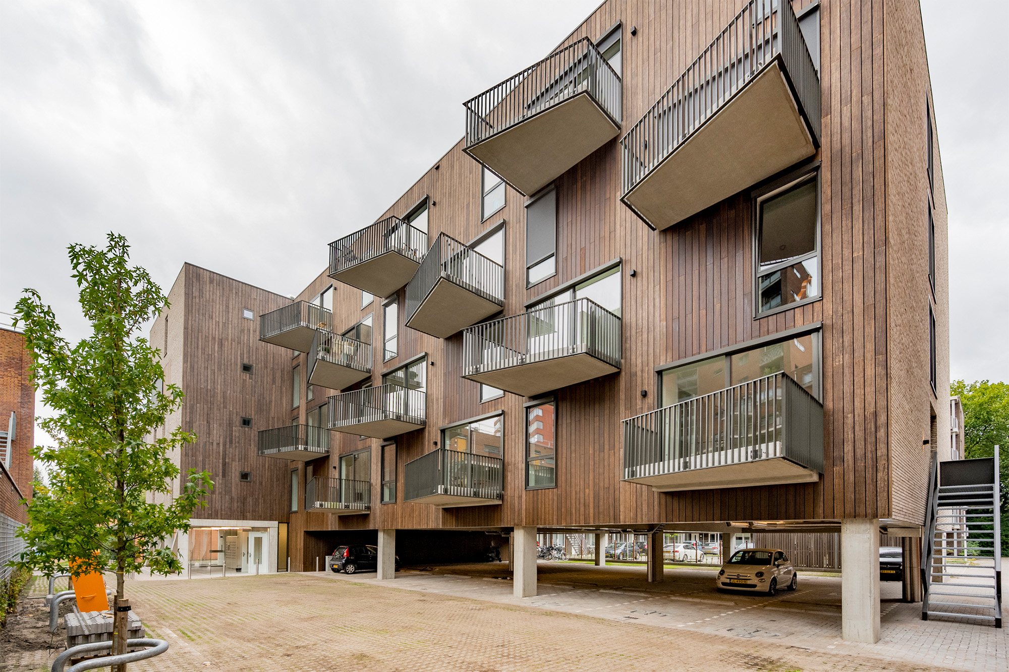 De poot van het T-vormige gebouw vult het binnenterrein. Om dit te verzachten is hout gebruikt als bekleding van de gevels en balkons. Onder het blok op een half verhard “tapijt” liggen de parkeerplaatsen. Het plan is all-electric. PV-panelen bedekken het dak.