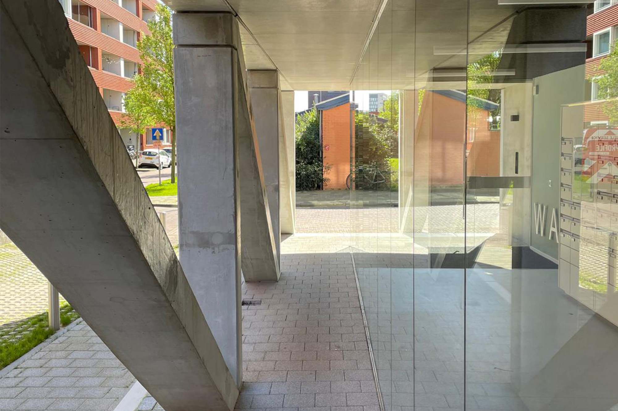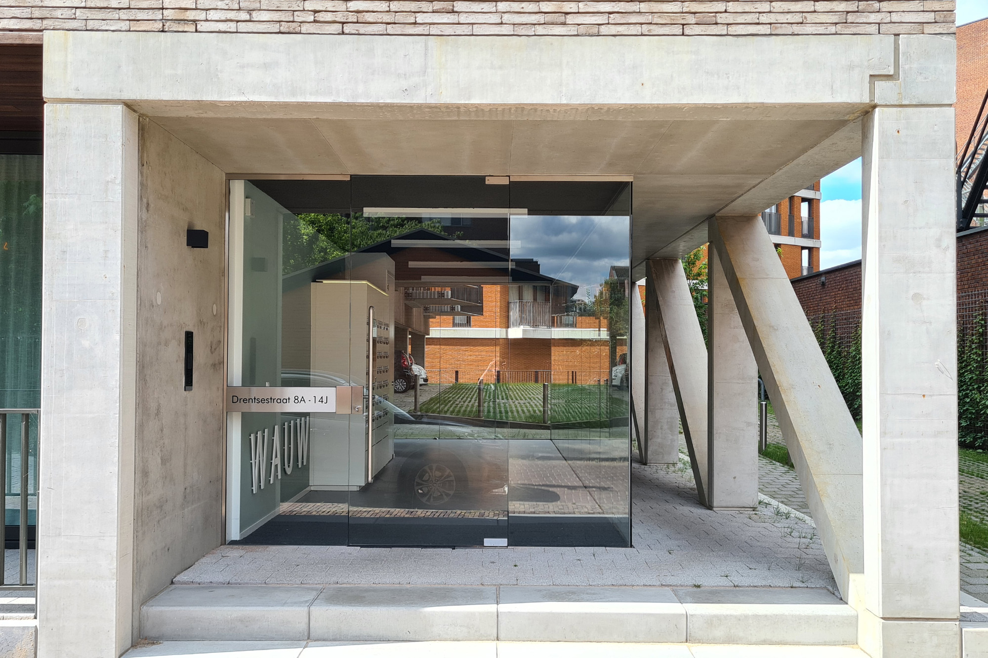 De entree ter plaatse van de doorgang is manifest vormgegeven door een betonnen frame en glazen inkom.